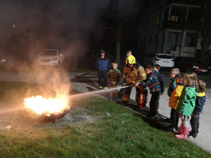 Pri nas se z ognjem poigrajo tudi otroci. Spoznavamo gašenje začetnih požarov z gasilnikom na prah in peno. Naš podmladek obvlada!