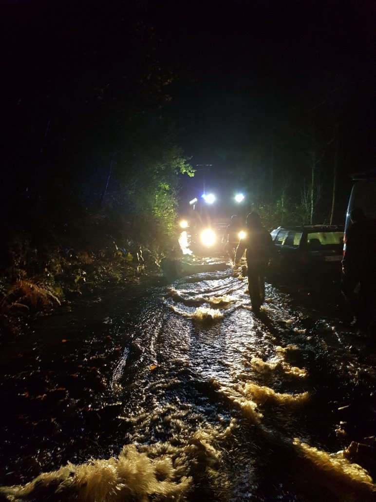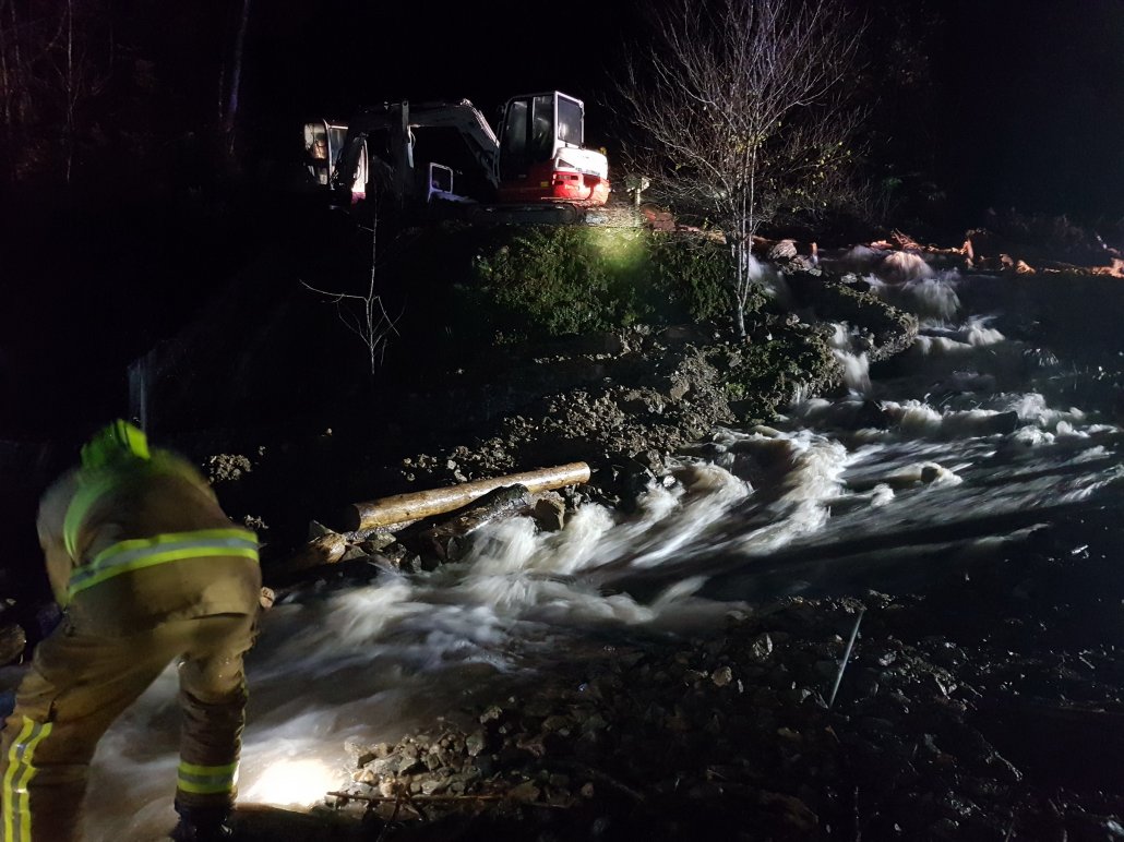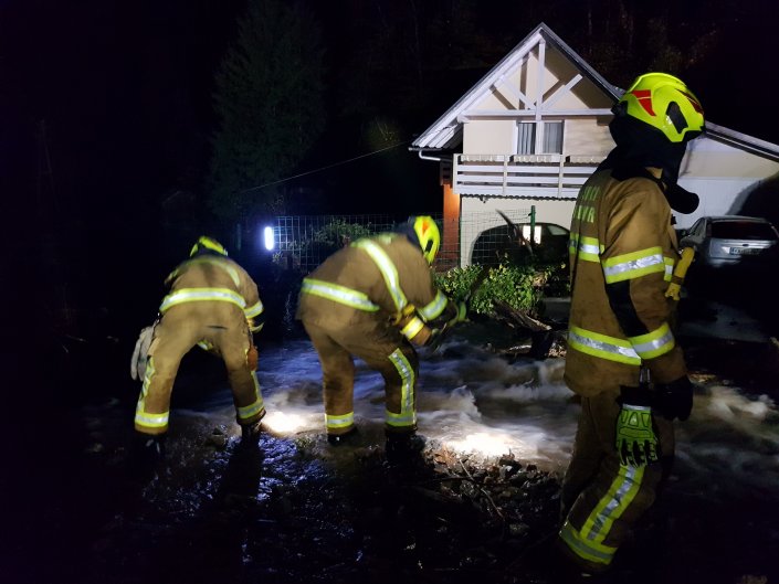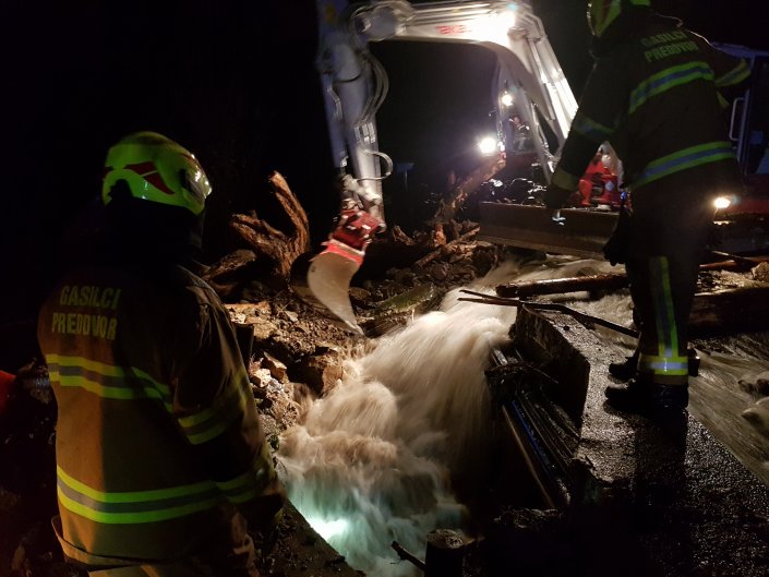 Pravkar smo se vrnili s posredovanja v Kokri, kjer so naplavine blokirale strugo potoka v prepustu pod cesto. Potok smo preusmerili stran od stanovanjske hiše, ki jo je ogrožal in s pomočjo gradbene mehanizacije očistili prepust.
